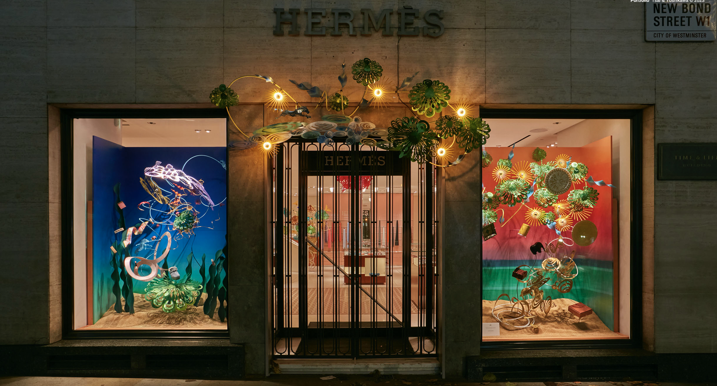 2022 Festive window display and in-store art installations aluminum, copper, neoprene, Perspex, light bulbs Commissioned by Hermes UK and Ireland,